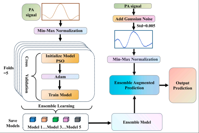 团队提出了一种基于粒子群优化与集成增强预测策略的卷积神经网络模型(PSO-EAP-CNN),解决了光声光谱气体检测中噪声引起的信号相关性退化问题。该模型通过多尺度特征提取机制与粒子群算法优化网络参数,显著提升了模型收敛速度和预测稳定性;同时引入集成增强预测策略,在噪声环境下进一步增强模型的鲁棒性和泛化能力。实验表明,PSO-EAP-CNN相比传统CNN模型,预测精度提升显著:平均绝对误差降低43.76%,均方根误差降低39.25%,平均绝对百分比误差降低51.15%。本研究为复杂噪声环境下的痕量气体检测提供了新方法,推动了深度学习在光声光谱领域的应用发展。该成果发表于《Photoacoustics》(《光声学》,中科院一区TOP,影响因子7.1),2023级硕士研究生苏占上为论文第一作者,王朋朋副教授、朱存光副教授和中国海洋大学王福鹏副教授为共同通讯作者,聊城大学为第一署名单位。