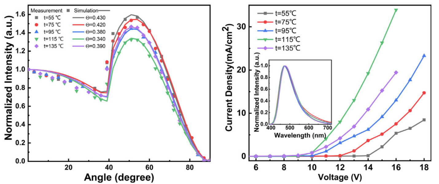1 不同退火温度下发光层的角度依赖荧光光谱 及对应OLED器件的电流密度-电压曲线,插图为归一化EL光谱