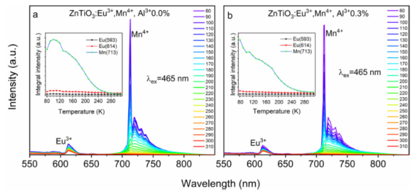 团队近年针对基于荧光强度比的荧光温度计进行了一系列的研究,该论文主要讨论了Eu3+,Mn4+掺杂ZnTiO3六棱晶体的结构和荧光特性,并分析了做为温度微探头的可能性。由于Zn2+-Eu3+替位造成晶体电荷不平衡从而引起发光淬灭行为,通过Al3+的掺杂进行电荷补偿,可以降低由于电荷不平衡造成的非辐射跃迁,从而提高发光效率;由于Mn4+的3d电子对结构对称性和温度的敏感度远高于稀土元素4f电子,在晶体中引入Mn4+,以红其光发射为读出信号Eu3+的荧光为参照信号,Mn4+的,得到了灵敏度为2.7 %K-1的高灵敏度荧光温度计,电荷补偿离子Al3+的引入降低了荧光强度比,使得最大灵敏度降低到1.75 %K-1,但是温度测量范围扩大了50 K。为基于过渡金属荧光比例温度计的设计和应用提供了新的方法和思路。