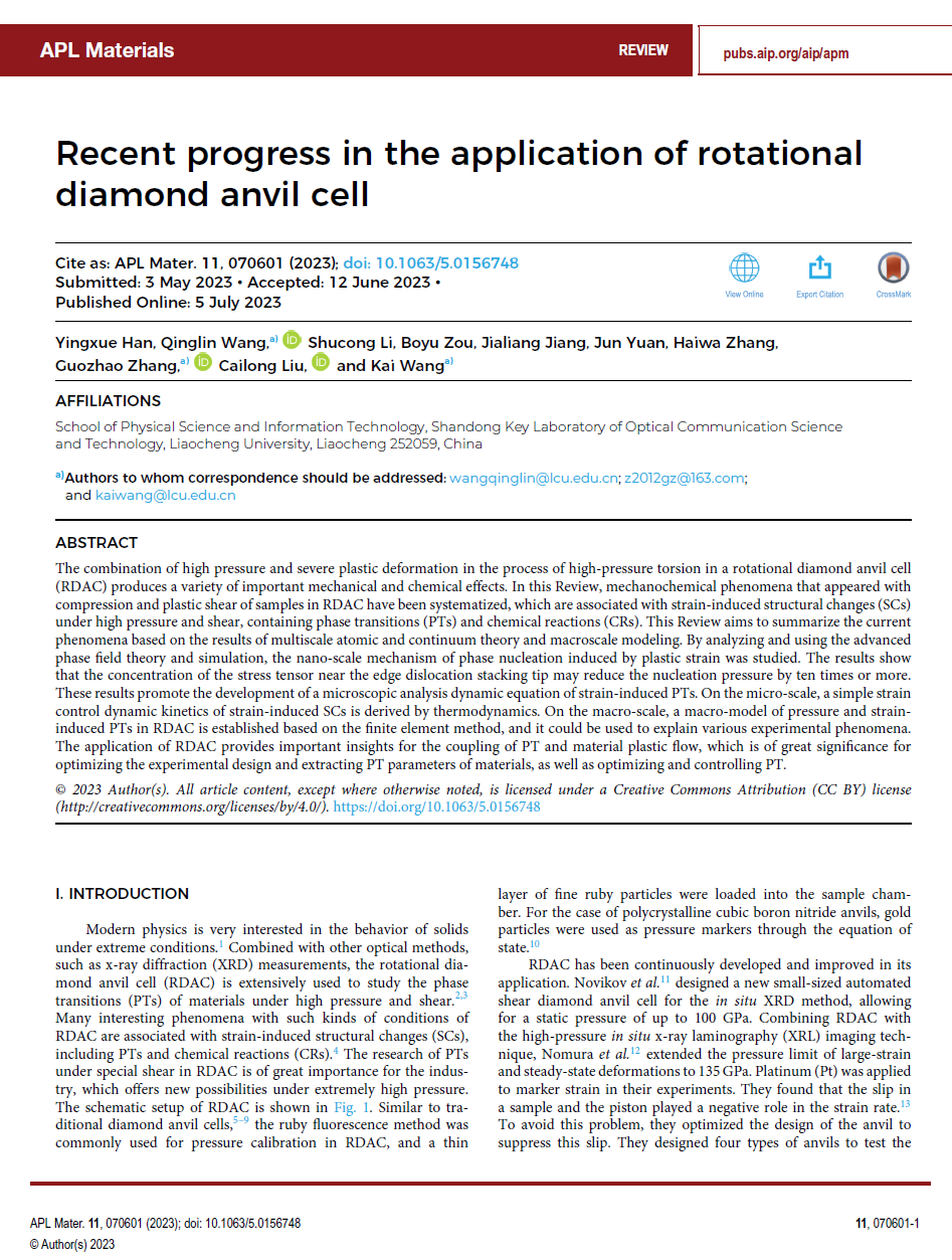 近日,K体育·「中国」官方网站泰山学者青年专家王凯教授团队指导本科生在《APL Materials》(中科院二区,影响因子6.1)上发表了题为“Recent progress in the application of rotational diamond anvil cell(旋转金刚石对顶砧技术的最新应用进展)”的综述文章。2020级物理学专业本科生韩莹雪为文章第一作者,王庆林副教授、张国召博士、王凯教授为共同通讯作者,刘才龙教授、张海娃博士,研究生邹博宇、姜家梁,本科生李树聪、袁骏共同参与了该K体育·「中国」官方网站作,聊城大学为唯一署名单位。