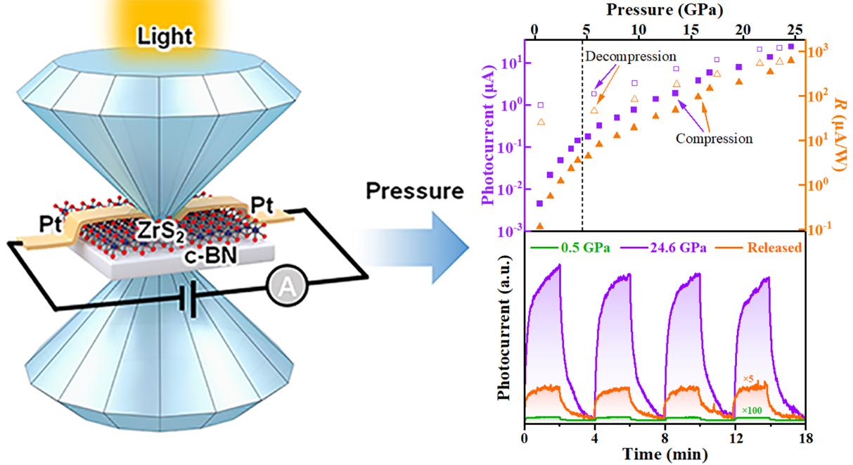 压力可以通过调控材料的晶体结构,进而实现对材料光电性能的调控。ZrS2作为一种典型的过渡金属硫族化合物(TMDs),相比于被广泛研究VIB族TMDs,理论上具有更优异的电子和光电性质,且在光电探测器、场效应晶体管和传感器等领域具有巨大应用潜力。作者们利用基于金刚石对顶砧的高压原位光电流、拉曼散射光谱、交流阻抗谱、吸收光谱的测量手段和理论计算方法相结合系统地研究了高压下层状ZrS2的光电性质。研究表明,加压过程中,随着压力的增加,层状ZrS2的光电流值持续增加,最终其光电流实现了三个数量级的增加;且拥有高光电响应的ZrS2高压相可以截获至常压。ZrS2的晶体结构、电输运性质和禁带宽度也均受压力调控。此项研究为科研K体育·「中国」官方网站作者通过高压合成性能优异的TMDs光电功能材料提供了新的思路,对未来光电器件性能的提升具有重要意义。我院2021级硕士生王娜和张国召博士为共同第一作者,冯振豹副教授、张海娃博士和刘才龙教授为共同通讯作者,聊城大学为第一署名单位。