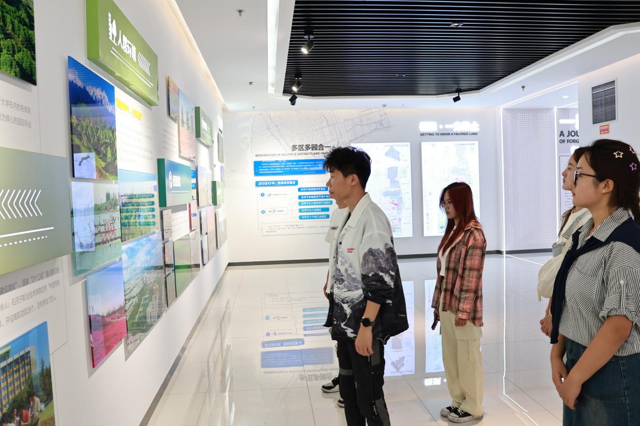在石河子经济技术开发区展览馆,谢彤详细讲解了开发区的地理位置、区位优势、产业集群和产业链布局。在参观过程中,实践队员们沿着开发区发展脉络,逐一参观展馆内的展示内容,通过文字纪实、图片资料、视频播放,重温石河子经济技术开发区的历史进程和发展成就,全面了解石河子经济技术开发区的蓝图规划、产业成果和未来规划,在参观中追忆峥嵘岁月、凝聚前行力量。