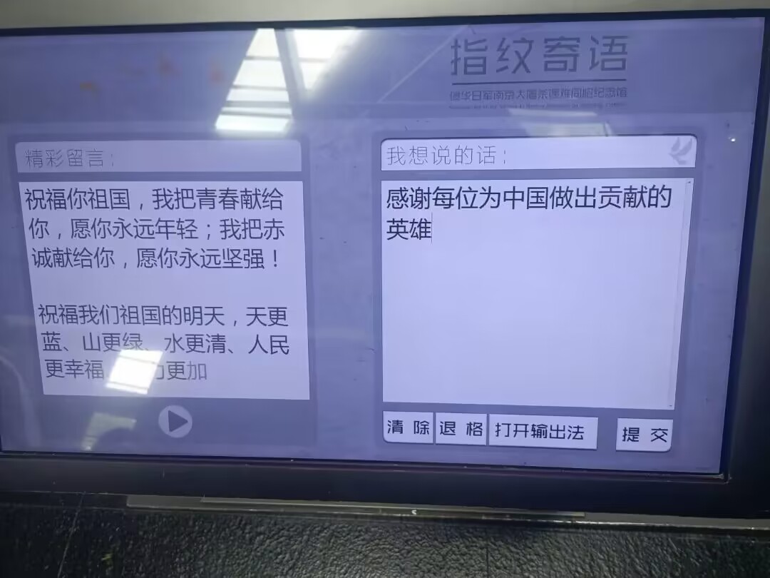 走访的最后,实践队队员代表在观众留言页上写下本次南京大屠杀遇难同胞纪念馆参观的感言:“中华民族与中国人民历来都不畏强迫,敢于同敌人斗争到底;和平一直是全体中华儿女的夙愿,愿世界永远和平繁荣昌盛”。铭记历史,就是要唤起善良的人们对和平的向往和坚守。经过本次走访,队员们对这段受侵略历史有了更深刻的认识和感悟。队员们将铭记历史,树立起人类命运共同体意识,摒弃偏见和歧视,相互尊重,共同追求和平、繁荣的美好愿景。