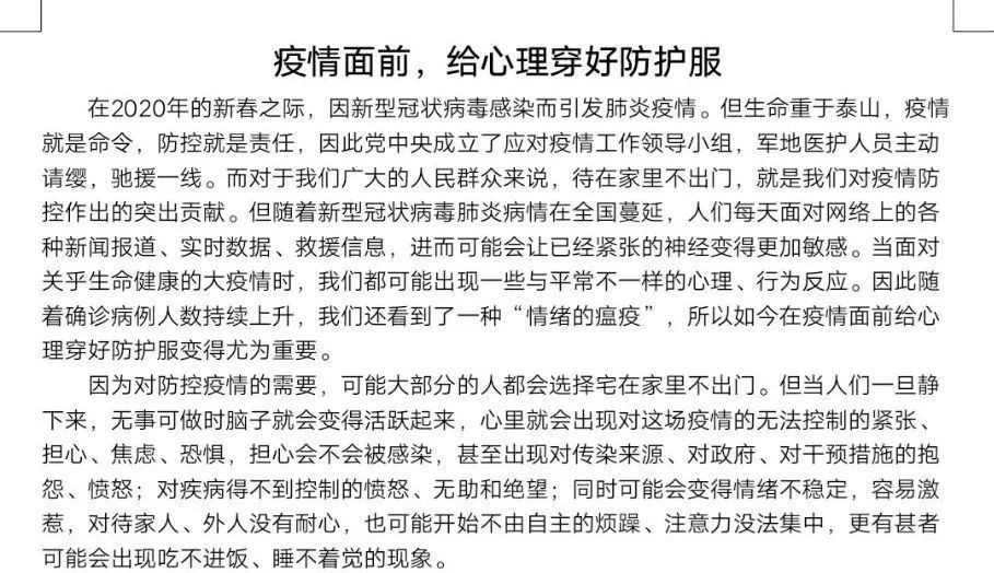 作为高校学子,大家度过了一个非比寻常的寒假,面对突如其来的疫情冲击,我们不可避免地会产生害怕、焦虑、恐慌等应激反应。面对这些情况,同学们都提出了自己的看法,部分同学在文中提到,面对疫情容易出现疑病心理,可以通过转移注意力的方法使自己保持心情愉悦,比如锻炼、听音乐、看书和学习等,可以使自己的心情放松下来,自我调整。还有部分作品提醒我们,远离小道消息,关注官方信息,也不要轻易相信网络谣言,从而减少刺激,稳定心绪。