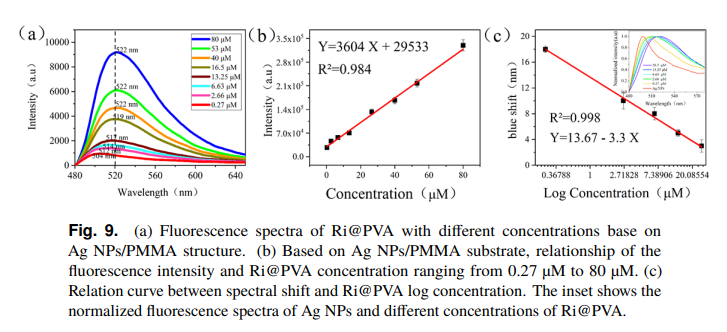 在“Ag NPs/PMMA nanocomposite as an efficient platform for fluorescence regulation of riboflavin”论文中,利用等离子体增强荧光和荧光光谱位移两种方式实现了核黄素的检测。核黄素是我们身体不可或缺的一部分,其含量可用于判断身体健康状况,光敏性可用于判断食品是否过期,药理特性可用于治疗炎症、心绞痛和其他疾病。面对诸多领域的应用,核黄素的检测必不可少。荧光检测法因核黄素拥有天然的荧光响应而具备优势。本K体育·「中国」官方网站作中,课题组报道了一种基于Ag NPs和PMMA协同效应的荧光检测平台。引入Ag NPs以实现等离子体增强荧光,薄PMMA层不仅通过增强基底的粘附来增强荧光,还可用作间隔物来优化等离子体增强荧光效应。基于该平台实现了核黄素的检测,最低可检测浓度低至0.27 μM,除了基于等离子体增强荧光的检测之外,低浓度的核黄素的检测也可以通过由于Ag NPs引起的荧光峰的移动和加宽来实现。该平台在荧光分子检测和光学传感领域具有巨大的应用潜力。