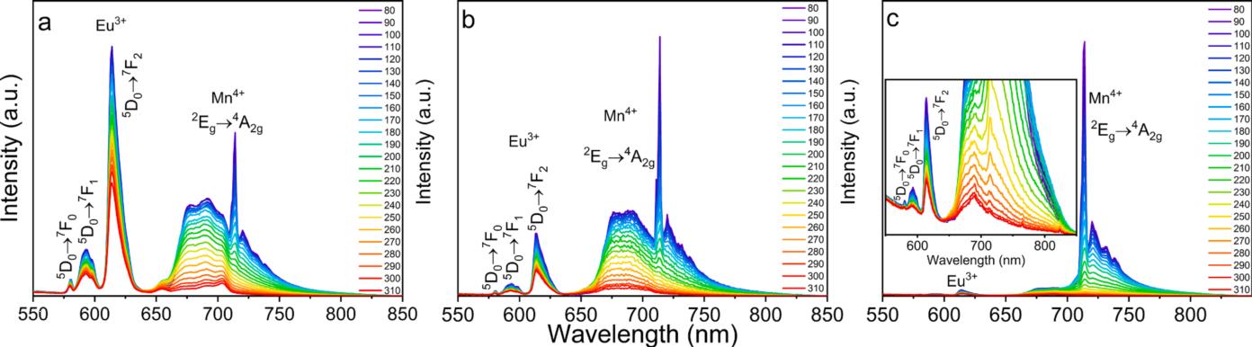 由于具有响应速度快、测量精度高、可远距离非接触测量等优点,基于荧光强度比的荧光测温法受到人们广泛关注。在高发光效率的前提下,如何提高荧光温度计的灵敏度成为人们研究的重点。针对该问题,课题组研究人员提出了电荷补偿和双相共生长协同作用提高荧光温度计性能的方法,利用该方法可有效提高了晶体的发光效率和温度灵敏度。第一项K体育·「中国」官方网站作(《Influence of charge compensation on the photoluminescence and temperature sensing of zinc titanate composites》)中,研究人员分别在ZnO-TiO2混合相、ZnTiO3钛铁矿-钙钛矿混合相以及TiO2-Zn2TiO4混合相中掺杂了Li+,通过Li+补偿Eu3+与Ti4+和Zn2+的电荷差,提高了晶体的发光效率,并利用混合相中晶体场的差异,提高了晶体的温度灵敏度,解决了电荷平衡中高发光效率低灵敏度的问题。第二项K体育·「中国」官方网站作(《Dual-mode optical thermometer based on fluorescence intensity ratio of Eu3+/Mn4+ co-doping zinc titanate phosphors》)中,研究人员在第一项K体育·「中国」官方网站作的基础之上,制备了具有钛铁矿和钙钛矿同质异构的ZnTiO3纳米晶体,利用Mn4+在钛铁矿和钙钛矿晶格中的能级跃迁差异,实现了3.2 %/K的高相对灵敏度和0.01K的温度分辨率。上述成果对新型高灵敏度荧光温度计的设计具有一定的指导意义。