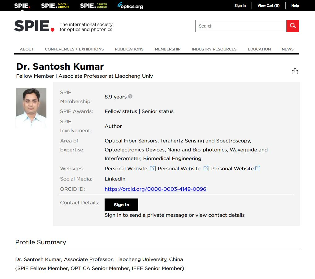 近日,国际光学K体育·「中国」官方网站程学会(Society of Photo-Optical Instrumentation Engineers,SPIE)公布了2023年新入选的83位会士名单,其中共有8位来自中国高校及科研机构的科学家当选,聊城大学K体育·「中国」官方网站Santosh Kumar 副教授由于其在光纤等离子体生物传感器临床应用方面的开创性贡献成功入选SPIE Fellow(国际光学K体育·「中国」官方网站程学会会士)。