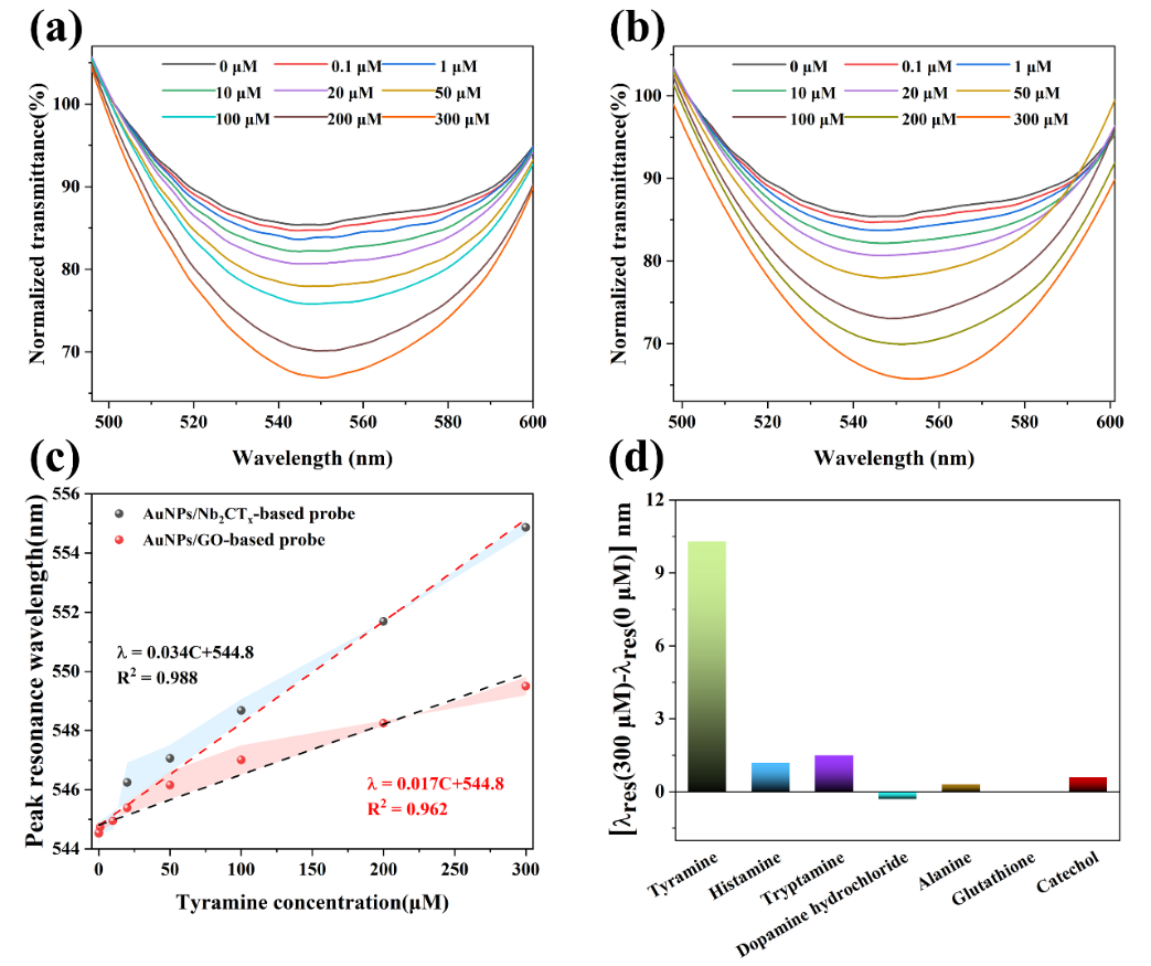 在这项K体育·「中国」官方网站作中,研究人员开发了一种基于Nb2CTx MXene增强的双S锥光纤(DSF)结构LSPR传感器探针,用于实现酪胺浓度检测。与传统的锥形光纤相比,DSF结构可以在传感区域提供更强的倏逝场以激发LSPR。研究者们分别利用金纳米粒子/氧化石墨烯/酪氨酸酶(AuNPs/GO/酪氨酸酶)和AuNPs/Nb2CTx/酪氨酸酶在传感器区功能化,开发了两种不同DSF结构的探针,并对比了不同酪胺浓度下传感器的峰值共振波长漂移量。实验结果表明,Nb2CTx增强的传感器探针具有更高的灵敏度和更好的线性拟合度,在0-300 μM酪胺浓度范围内,探针的灵敏度和检测限分别为34 pm/μM和0.352 μM。本K体育·「中国」官方网站作为增强LSPR作用和提高LSPR传感器灵敏度提供了研究平台。