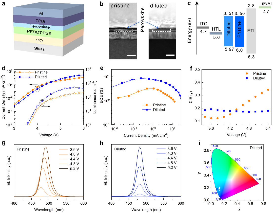 本文针对混合卤素容易在电场下发生相分离的问题,提出了调控结晶动力学的方法,通过稀释前驱体的浓度改善钙钛矿成膜和卤素分布。结果表明均质化的卤素分布降低了非辐射复合速率,同时抑制了离子迁移。制备的器件达到8.5%的外量子效率,并且在482nm处实现稳定的天蓝光发射(如图1所示),此K体育·「中国」官方网站作为解决目前蓝光普遍存在的相分离问题提供了一种简单的方案。
