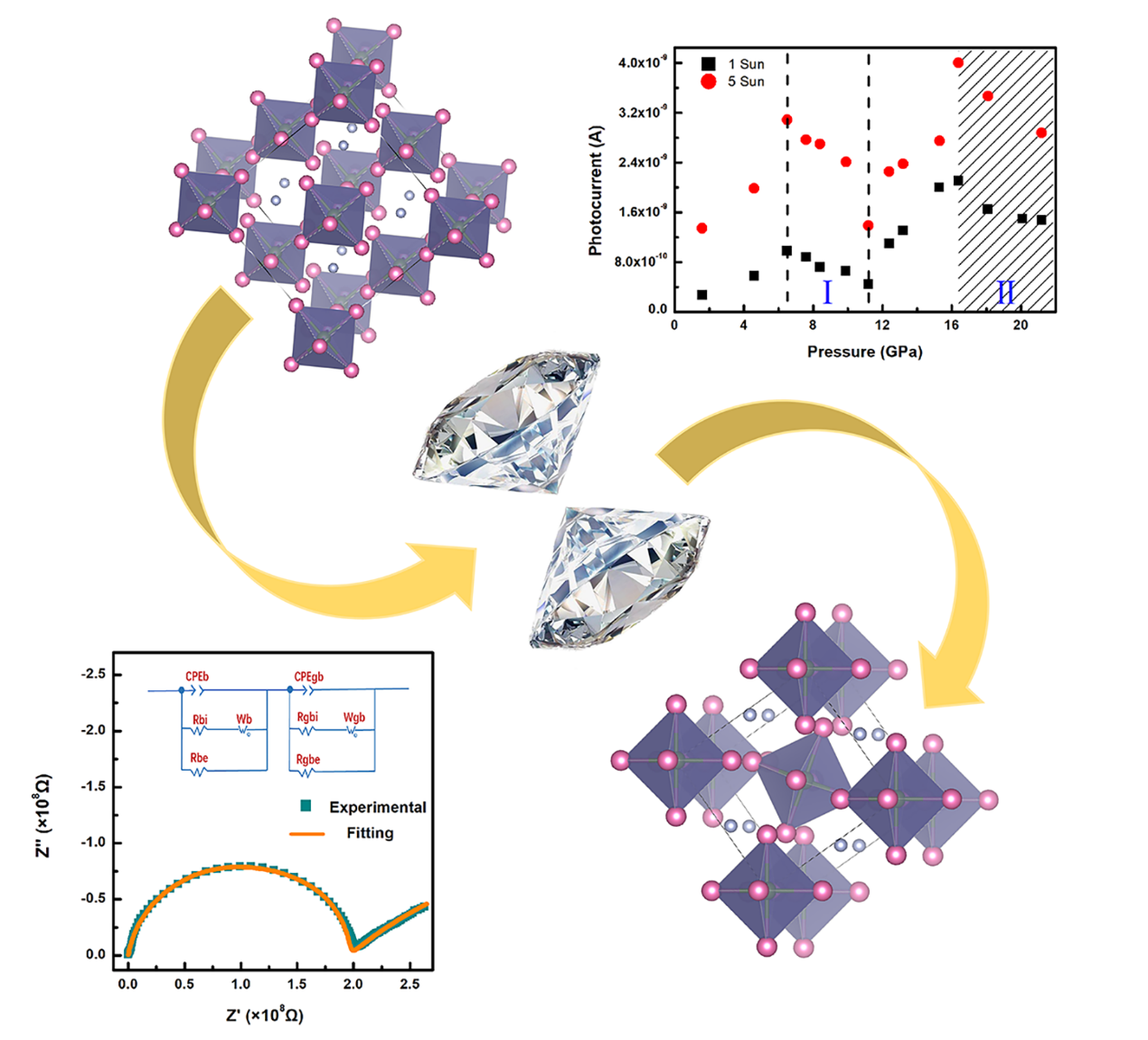 压力在调控卤化物钙钛矿太阳电池材料的光响应和电输运性质中扮演者重要的角色。(NH4)2SeBr6作为非铅卤化物双钙钛矿材料,避免了有毒铅元素的使用,是清洁光伏和光电器件的理想候选材料之一。本K体育·「中国」官方网站作中,作者们通过高压原位拉曼散射光谱测量实验研究发现(NH4)2SeBr6在16.0GPa发生了立方相到四方相的结构相变,通过高压原位交流阻抗谱和直流光电导测量实验研究了(NH4)2SeBr6在常压至21.2GPa的电输运和光电响应特性。研究发现,(NH4)2SeBr6的光电流随压力逐渐增强,在6.5GPa处达到第一个峰值,之后光电流值随压力的增加逐步减小,在11.2GPa出现第二次光响应增强,并在16.4GPa处达到第二个峰值。(NH4)2SeBr6在II相(四方相)的光电响应优于I相(立方相)。在整个压力区间内电子传导在(NH4)2SeBr6样品的电输运过程中起主导作用。这些研究可以更加深入地了解非铅双钙钛矿材料,对将来更好地开发钙钛矿光伏光电器件具有实际的帮助。
