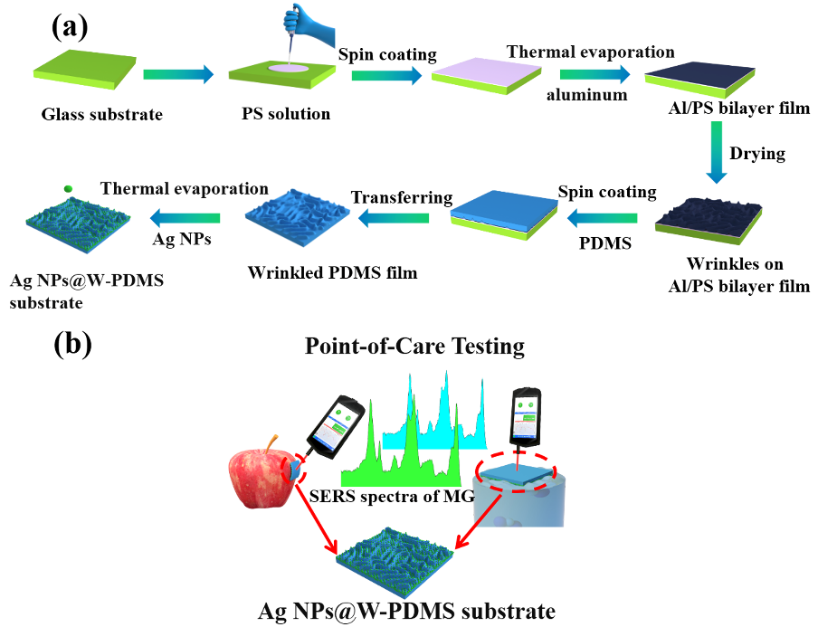 近日,聊城大学K体育·「中国」官方网站李和福副教授课题组在柔性SERS基底制备方面取得新进展。研究成果以“Versatile flexible SERS substrate for in situ detection of contaminants in water and fruits based on Ag NPs decorated wrinkled PDMS film”(《基于银纳米颗粒修饰皱褶聚二甲基硅氧烷薄膜的多功能柔性表面增强拉曼散射基底及其用于水中和水果表面污染物的原位检测》)为题,发表于《Optics Express》(《光学快报》,中科院二区,影响因子3.833)。该论文的第一作者为2020级硕士研究生张厚加,李和福副教授、王扬志博士为共同通讯作者,聊城大学为第一署名单位。