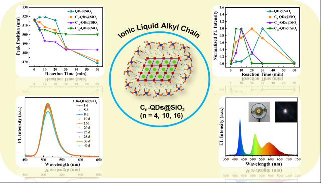 核壳量子点由于其优异的光电子特性而成为未来光电器件的候选者。然而,不稳定性和硅烷水解过程中醇和水的生成问题限制了它们的进一步发展。本K体育·「中国」官方网站作通过引入不同烷基链长度的离子液体(ILs)作为表面配体,同时利用四甲氧基硅烷(TMOS)水解作用,成功制备了Cn-QDs@SiO2 (n = 4, 10, 16)量子点。随着烷基链长度的增加,量子点峰位置蓝移值和 PL 强度达到最大值的时间减小,表明烷基链的增长加快TMOS水解速度。由于ILs表面钝化作用,量子点的荧光量子产率高达92.83%且具有优异的稳定性。基于该量子点优异的光学性质和稳定性,成功将其应用于白光发光二极管。本研究为解决硅包覆量子点的稳定性问题,促进硅包覆钙钛矿量子点在固态发光二极管中的实际应用提供了一种有效策略。