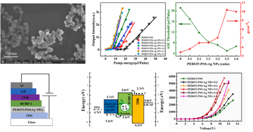 有机半导体激光在显示和照明领域有极大的潜在应用。降低有机增益介质的放大自发辐射(ASE)阈值和优化器件结构是实现电泵浦有机激光的关键因素。在这项K体育·「中国」官方网站作中,我们将AgNPs以一定的体积比掺入PEDOT:PSS中,在研究光放大行为时,可以作为缓冲层;在研究OLED器件发光性能时,可以作为空穴传输层。研究表明:在AgNPs:PEDOT:PSS最佳体积比时,该缓冲层使得CBP:45 wt%BUBD-1混合膜的ASE阈值降低了6倍;在OLED器件中作为空穴传输层时,器件的亮度提高了1倍,最大外量子效率提高了近2倍。器件性能的提高,可以归因于AgNPs的局域表面等离子共振效应及由此导致的空穴迁移率提高。下图为部分实验结果图。