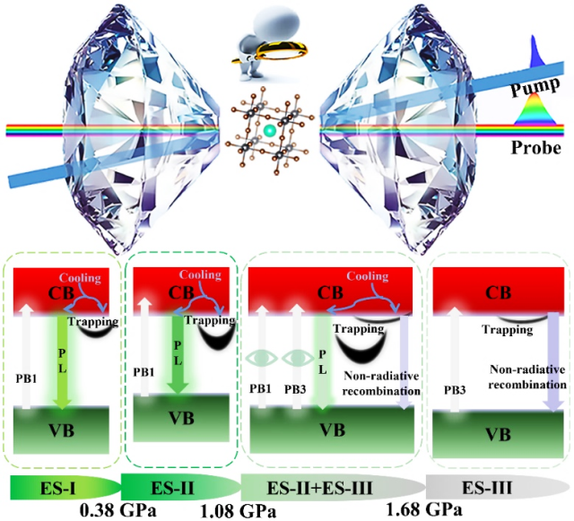 进展一:钙钛矿材料中的载流子超快动力学行为一直以来备受关注。刘才龙教授团队利用高压原位稳态光致发光、稳态吸收和飞秒瞬态吸收光谱探测技术,对CsPbBr3量子点压致电子态转变、荧光猝灭和带隙演化中的超快动力学行为进行了实验探究。研究发现,高压原位飞秒瞬态吸收光谱可以有效区分混合电子态,并获得压力依赖的载流子超快动力学寿命,揭示了CsPbBr3量子点压致荧光猝灭和消失的微观物理机制。这项K体育·「中国」官方网站作对于改善钙钛矿材料的光物理性能至关重要,为拓宽其在光电探测器、发光二极管和太阳能电池等领域的应用提供了重要的指导。相关研究成果以“Ultrafast Dynamics across Pressure-Induced Electronic State Transitions, Fluorescence Quenching, and Bandgap Evolution in CsPbBr3 Quantum Dots”(CsPbBr3量子点在压力诱导的电子态转变,荧光猝灭和带隙演化过程中的超快动力学)为题发表在《Advanced Science》(《先进科学》)上。2021级硕士生陈林和楚亚博士为共同第一作者,张海娃博士、郑州大学郭海中教授和刘才龙教授为共同通讯作者,聊城大学为第一署名单位。