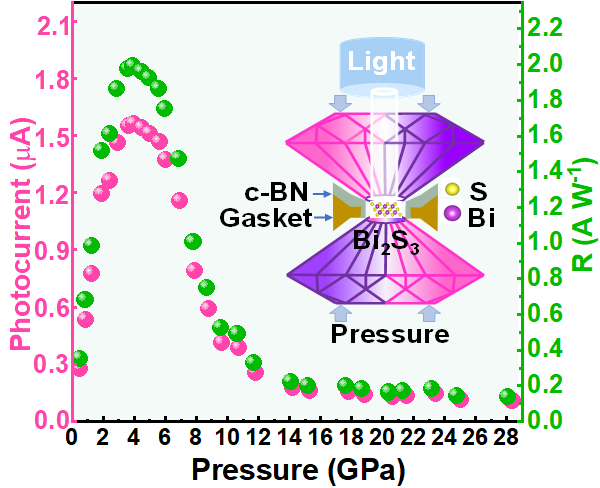 Bi2S3具有低毒性、低合成成本、吸收系数及载流子迁移率高等优点,成为光电探测器的潜在候选者。然而,由于其电子-空穴复合速度快和光腐蚀等影响降低了其光敏行为。为克服这一挑战,刘才龙教授团队提出压力调控Bi2S3光电响应的方案。通过将高压原位光电流、变温电阻率、拉曼散射光谱、可见吸收光谱测量和理论计算方法相结合,系统研究了压力作用下Bi2S3的光电、电输运、振动模式和能带结构。研究发现,压力作用下Bi2S3显示出两种不同的光响应信号(正/负光电流),0.5~4.0GPa范围内光电流随压力的增加出现显著增强(最大值约为初始值的5.6倍)。在30.3GPa以上,Bi2S3呈现负光电流响应,可归因于压致金属化相变引起的光热效应。研究结果为调控Bi2S3的光电性能提供了新思路,为优化基于Bi2S3光电子器件提供了更多的可能性。相关成果以“Pressure-induced photo responsiveness enhancement and positive–negative switch in Bi2S3(Bi2S3中的压力诱导光响应增强和正负光电流转换)”为题发表在《Applied Physics Letters》(《应用物理快报》)上。2021级硕士研究生冯浩铖和张国召博士为论文共同第一作者,王光宇博士、房媛媛副教授和冯振豹副教授为共同通讯作者,聊城大学为第一署名单位。