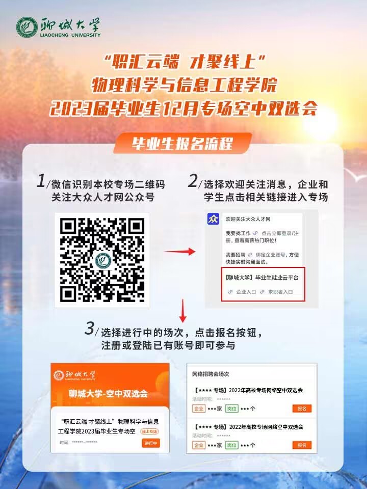 手机微信扫码关注“大众人才网”微信公众号,企业和毕业生分别点击相关按钮进入聊城大学校招端口,点击本学院报名按钮,注册或登录已有账号即可直接参与。