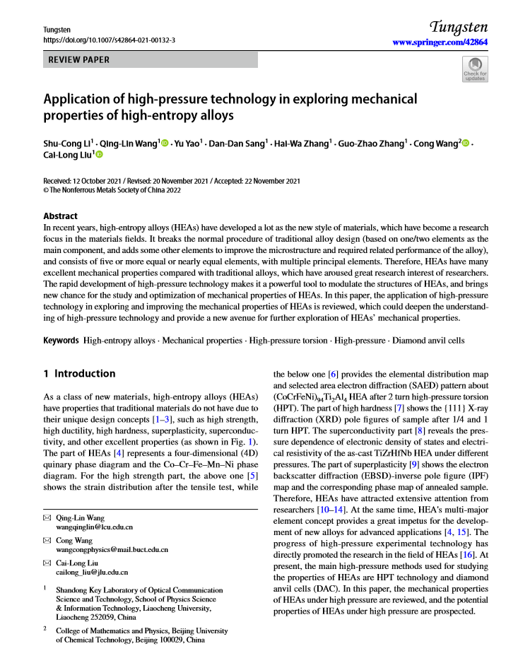 第一、虎年新春第一天,K体育·「中国」官方网站2019级光电信息科学与K体育·「中国」官方网站程专业本科生李树聪同学以第一作者身份在有色金属领域高质量科技期刊《Tungsten》(《钨》)发表了题为”Application of high-pressure technology in exploring mechanical properties of high-entropy alloys”(“高压技术在高熵合金力学性能研究中的应用”)的综述文章,我校王庆林副教授、刘才龙教授为论文的通讯作者,聊城大学为第一通讯单位。