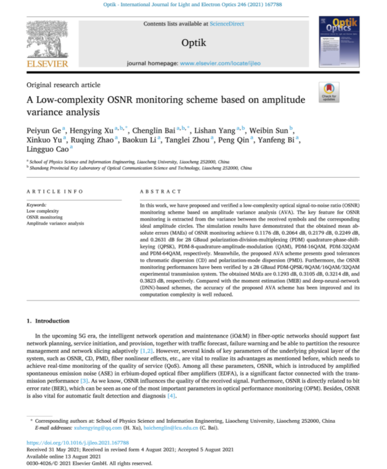 第二、2021年8月份,我院2018级通信K体育·「中国」官方网站程专业本科生葛佩云同学以第一作者身份在光学领域高质量科技期刊《Optik》(《光学》)发表题为”A Low-complexity OSNR monitoring scheme based on amplitude variance analysis”(“一种基于幅度方差分析的低复杂度光信噪比监测方案”)的研究论文,我校许恒迎教授、白成林教授为通讯作者,聊城大学为第一通讯单位。